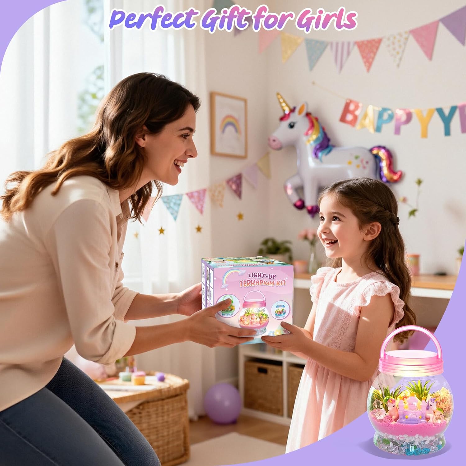 The terrarium includes glow-in-the-dark elements that add a magical effect at night. It becomes a charming light-up decoration, creating a dreamy unicorn-themed atmosphere in any room.